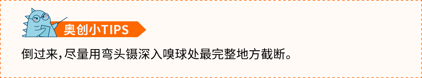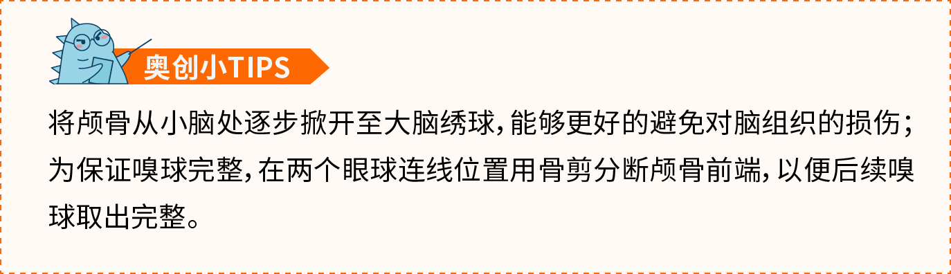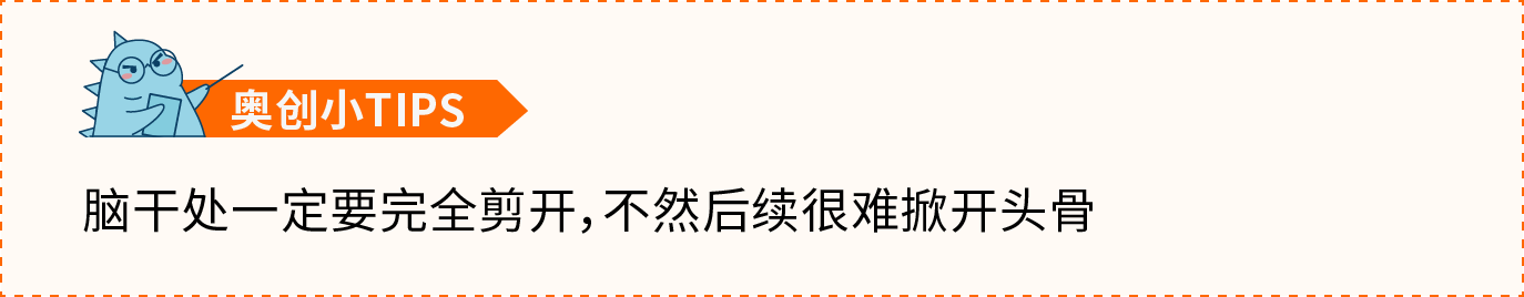 (2) 在小脑后端与脊柱的间隙处插入剪刀,剪断颈椎骨,分离出颅骨。