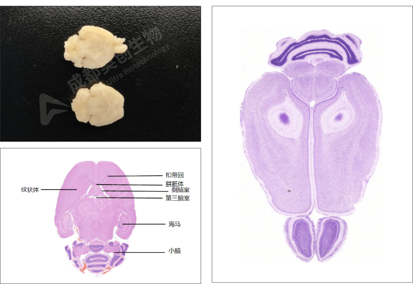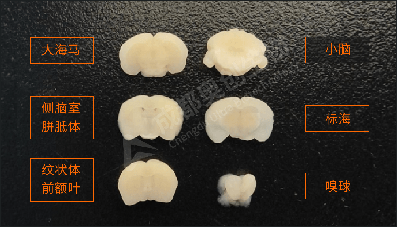 「固定后取材」水平面:可同时观察嗅球,皮层,纹状体,海马,脑干,小脑等:
