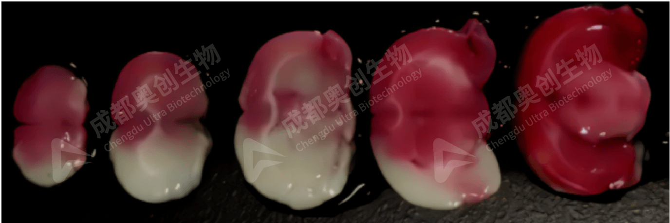 1、全脑缺血动物模型—模型成功的标志:大鼠应出现意识障碍,翻正反射消失。一般用TTC大体染色进行,TTC(2,3,5—氯化三苯基四氮唑)是脂溶性光敏感复合物,它是呼吸链中吡啶—核苷结构酶系统的质子受体,与正常组织中的脱氢酶反应而呈红色,而缺血组织内脱氢酶活性下降,不能反应,故不会产生变化呈现苍白色。