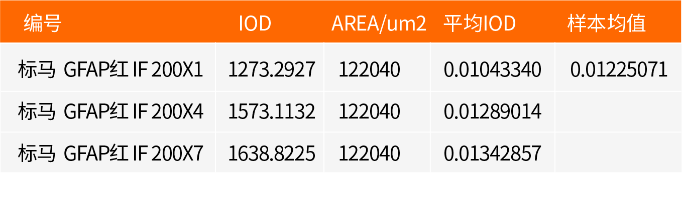 分析结果采用数字切片扫描仪/显微镜进行图像采集。每张切片先于低倍下观察全部组织,再分别选取3个视野采集200/400倍显微图像。采用Image-ProPlus图像分析系统测定所采集全部图像的荧光强度和面积,并计算每张图像的平均荧光强度,数据以积分光密度(IOD)表示;每例样本的平均荧光强度为3张图像的平均荧光强度的平均值。如: