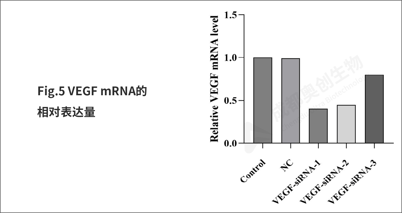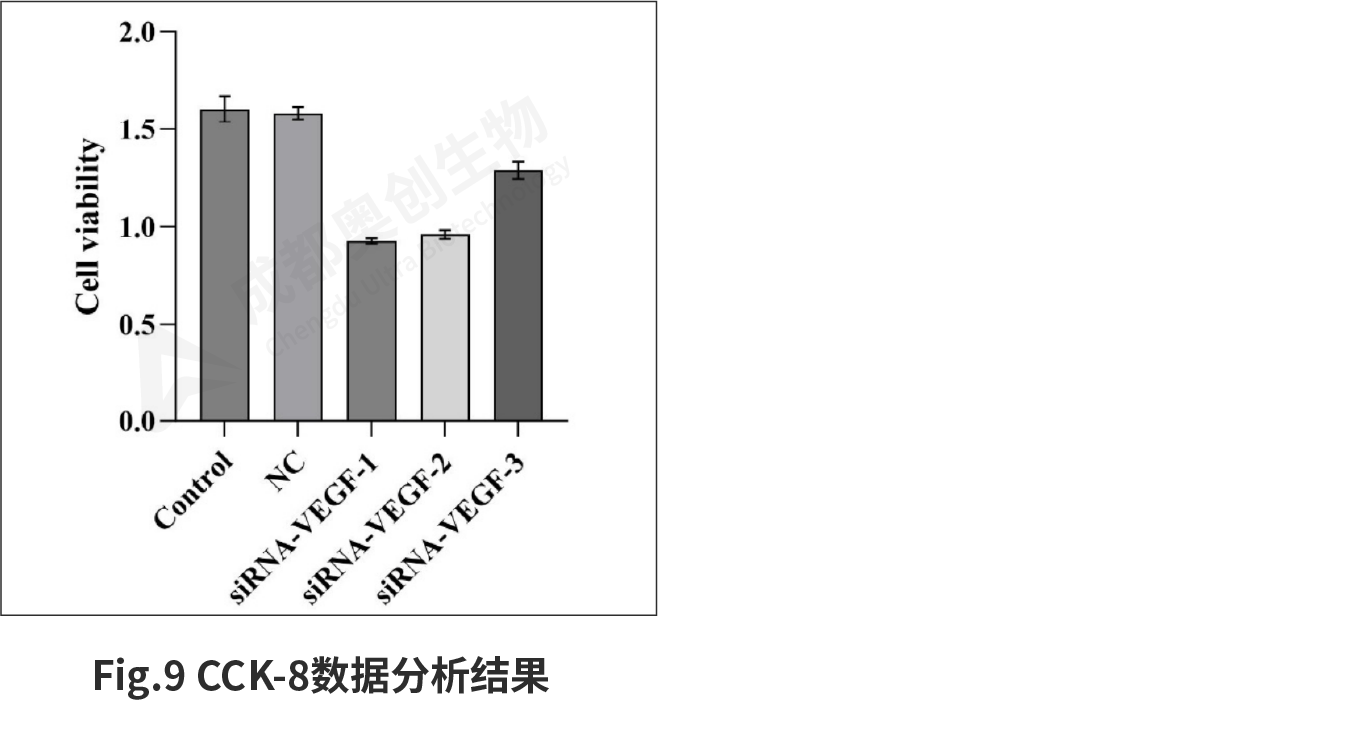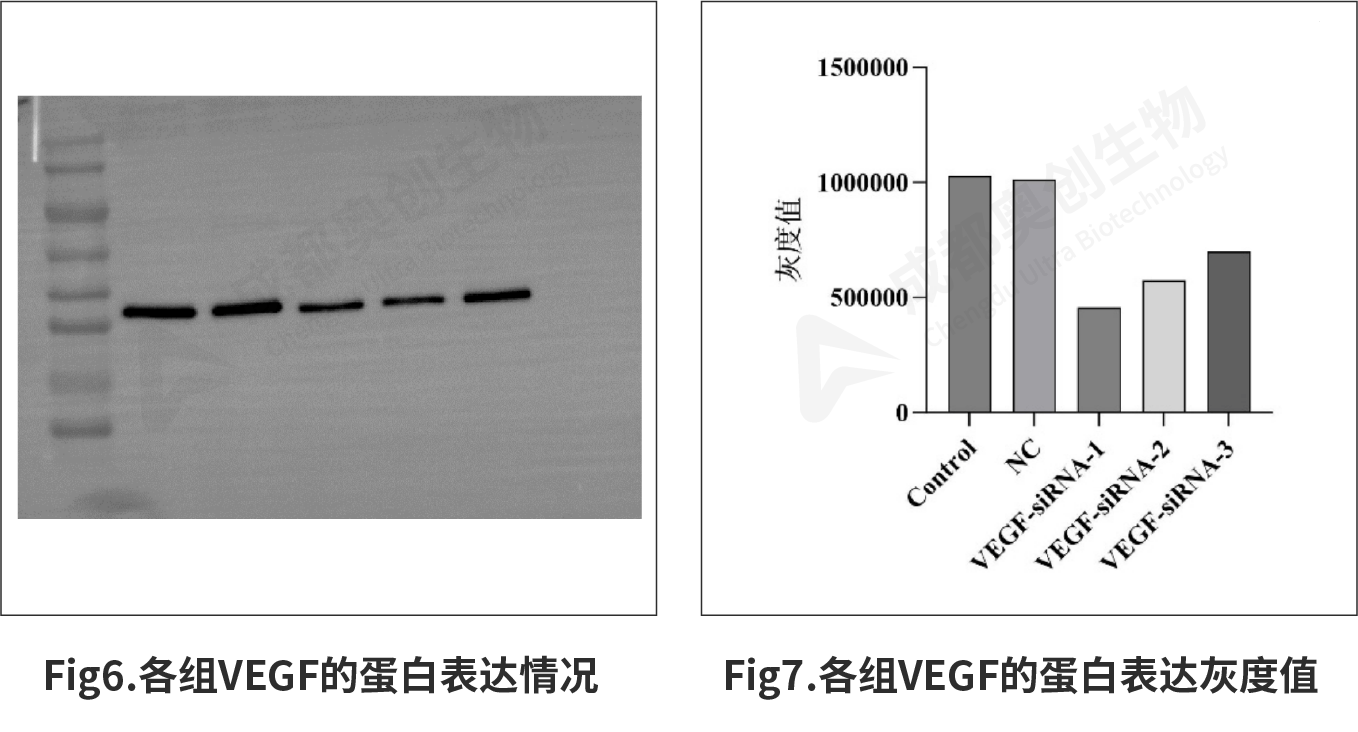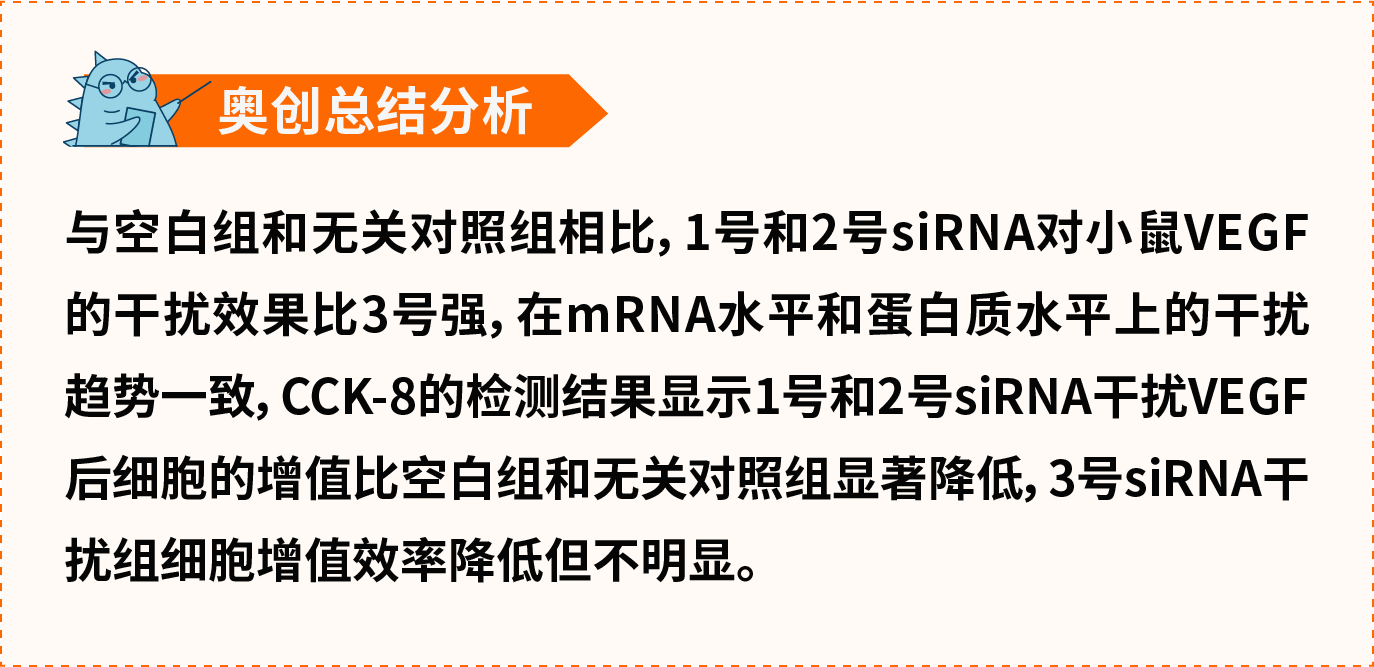 6、培养约2天左右后,收集细胞,使用RT-qPCR和Western-Blot检测siRNA对于靶基因VEGF的下调效果。CCK-8检测siRNA转染后对细胞增殖的影响。