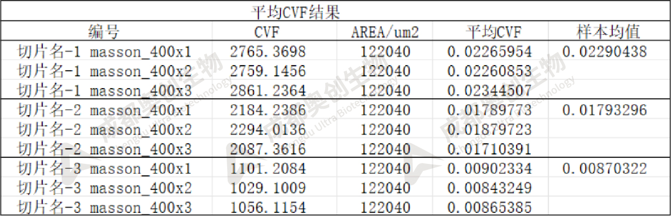 1、Masson:采用数字切片扫描仪/显微镜进行图像采集。每张切片先于低倍下观察全部组织,再分别选取3个视野采集200/400倍纤维图像。采用Image-ProPlus图像分析系统测定所采集全部图像面积和胶原阳性面积,并计算每张图像的CVF值;每列样本的平均CVF值为3张图像的平均值。