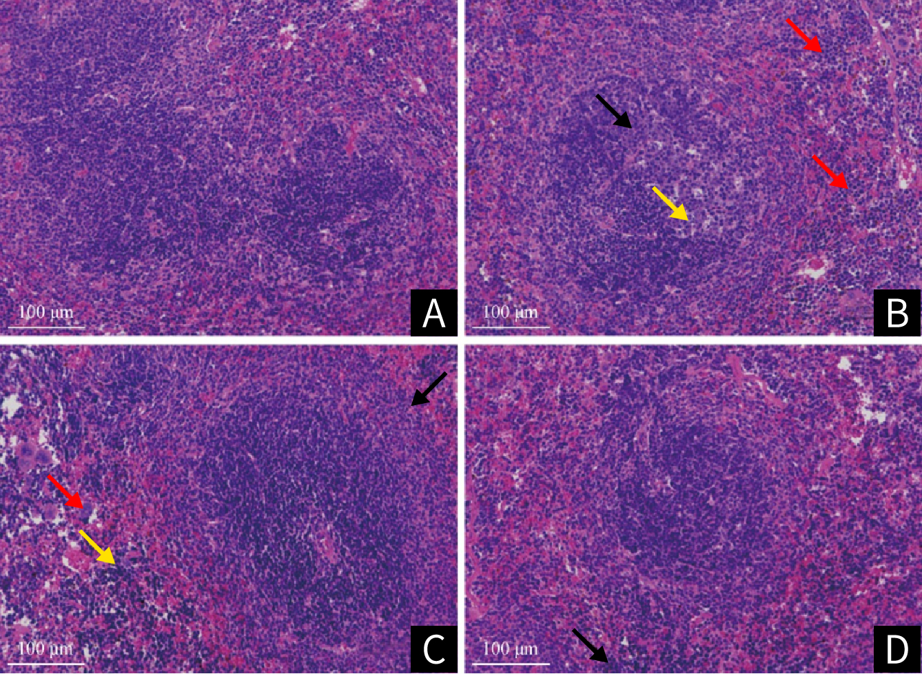 1、脾切除组小鼠参考Yin等的改良方法进行完全脾切除手术,麻醉,腹部剃毛、消毒,沿左侧腹中线肋下1 cm横行切口进入腹腔,游离脾脏,结扎脾动脉及静脉,切除全部脾脏。