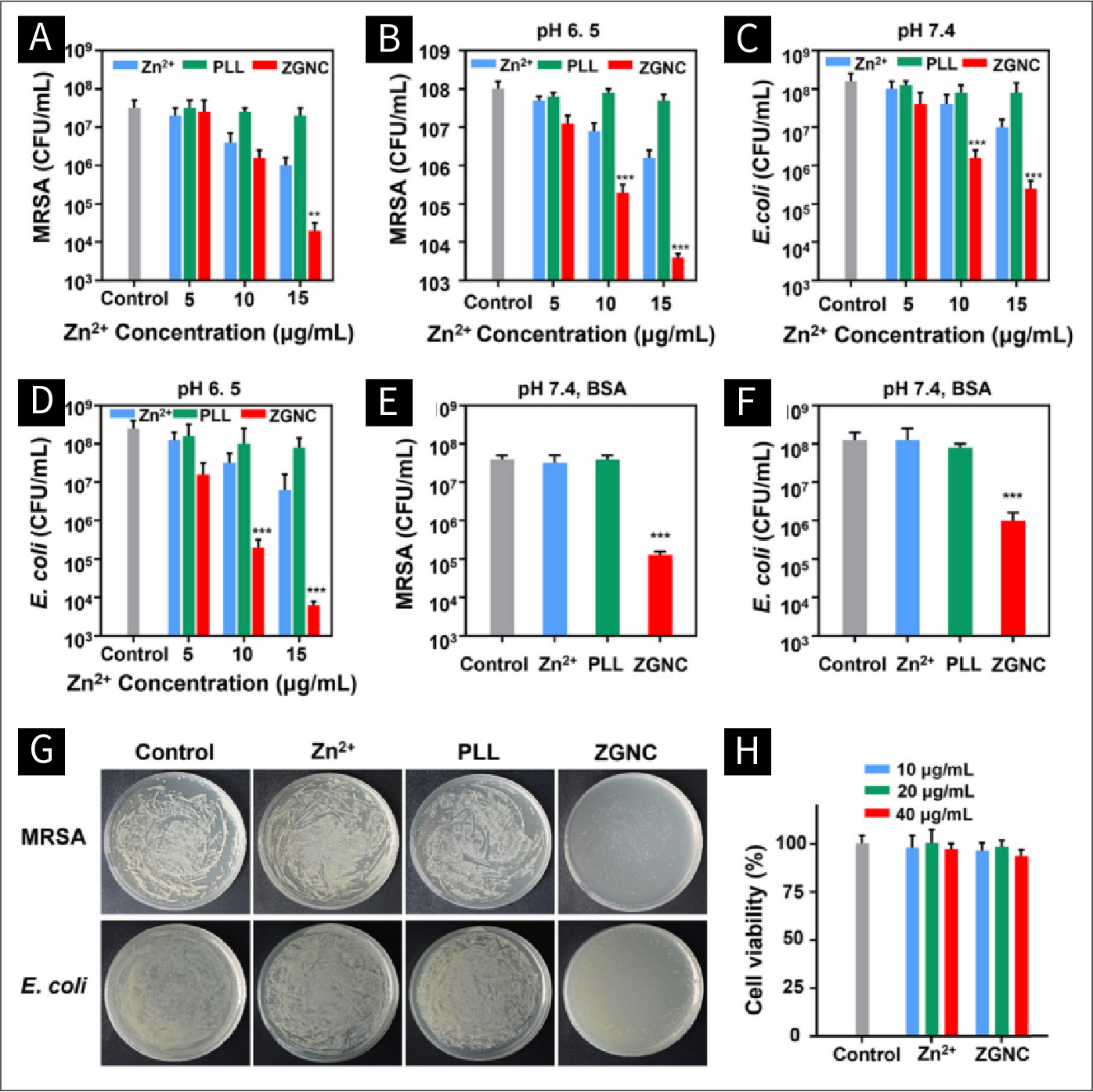 (a)ZGNC、Zn2+和PLL在pH 7.4下对MRSA的杀菌能力。PLL组的PLL浓度与ZGNC组相同。(b)ZGNC、Zn2+和PLL在pH 6.5下对MRSA的杀菌能力。PLL组的PLL浓度与ZGNC组相同。(c)ZGNC、Zn2+和PLL在pH 7.4下对大肠杆菌的杀菌能力。PLL组的PLL浓度与ZGNC组相同。(d)ZGNC、Zn2+和PLL在pH 6.5下对大肠杆菌的杀菌能力。PLL组的PLL浓度与ZGNC组相同。(e)ZGNC、Zn2+和PLL在BSA溶液中对MRSA的杀菌能力。PLL组的PLL浓度与ZGNC组相同。(f)ZGNC、Zn2+和PLL在BSA溶液中对大肠杆菌的杀菌能力。PLL组的PLL浓度与ZGNC组相同。(g)MRSA和大肠杆菌经ZGNC、Zn2+和PLL孵育后的平板图像。(h)MTT法测定HCECs经ZGNC和Zn2+孵育后的存活率。