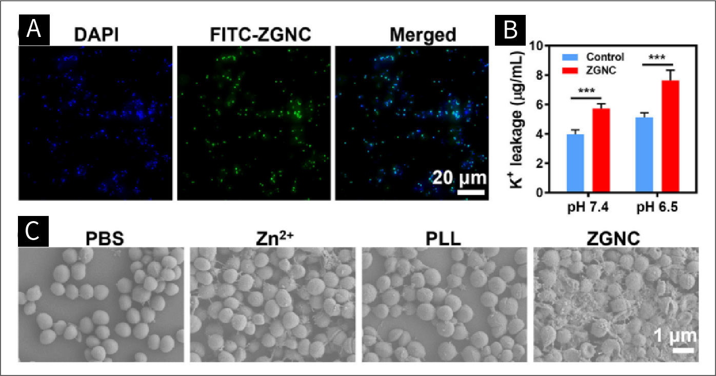 (a)DAPI染色的MRSA与FITC标记的MRSA孵育后的荧光成像。(b)MRSA经ZGNC在pH 7.4和6.5下孵育后培养基中K+浓度。(c)MRSA经ZGNC、Zn2+和PLL孵育后的SEM图像。