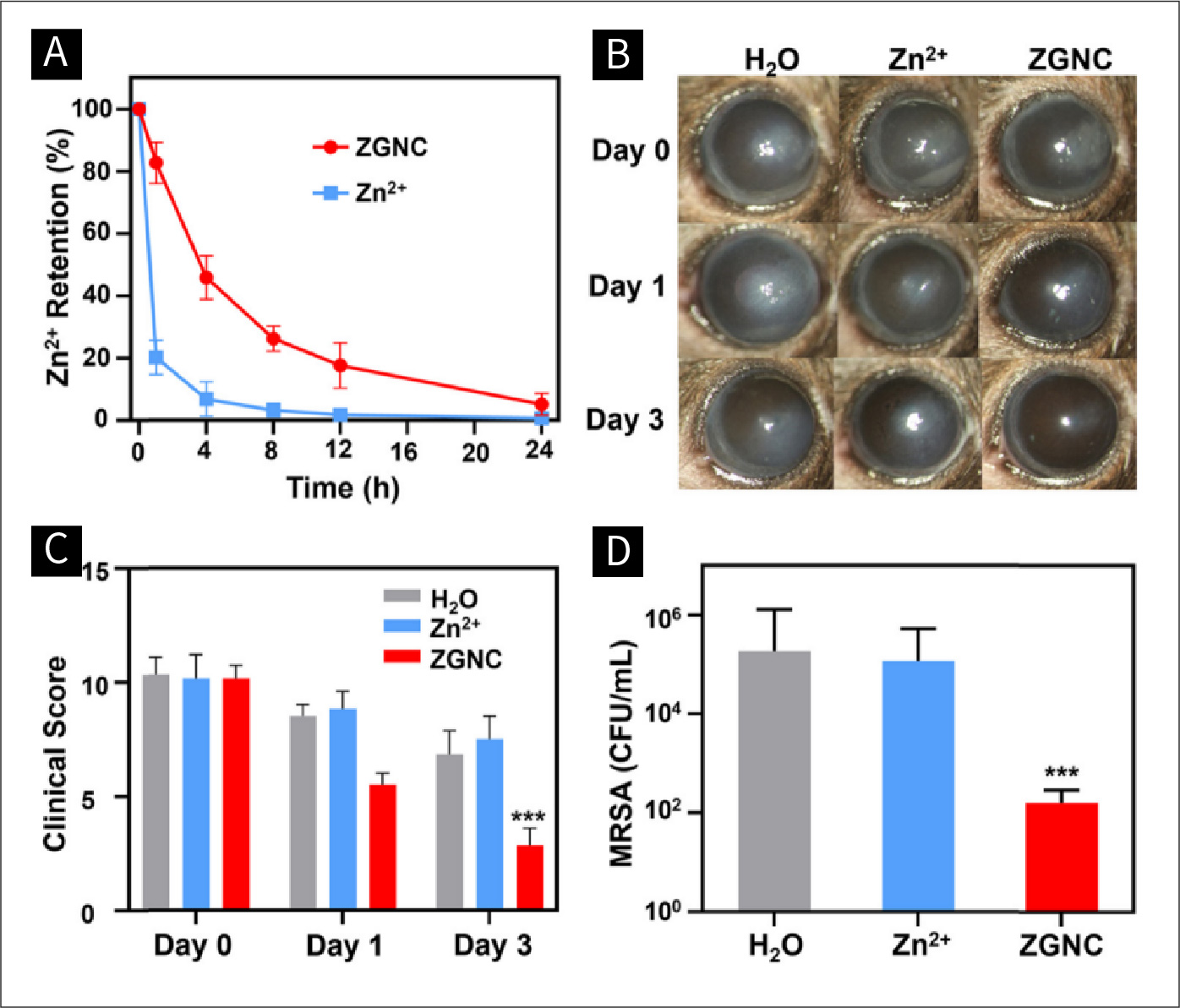(a)ZGNC和游离Zn2+治疗不同时间间隔后眼内Zn2+滞留情况。(b)第0天、第1天和第3天不同处理后的小鼠眼球裂隙灯照片。(c)第0天、第1天和第3天不同治疗后的眼部临床评分。(d)第3天不同处理后角膜组织MRSA菌落计数。