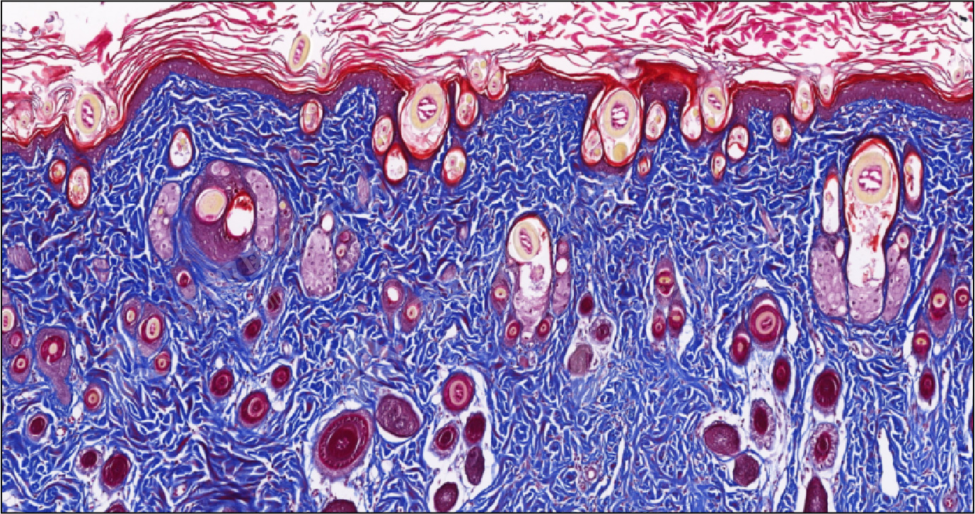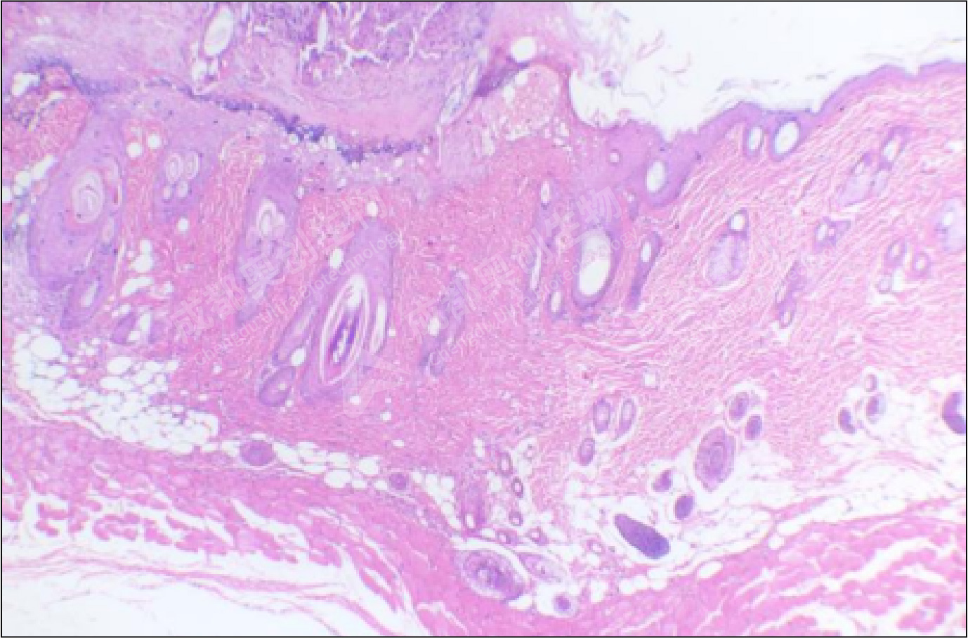 低倍镜下:伤口处皮肤各层结构较为清晰,瘢痕组织覆盖新生表皮;真皮层内皮肤附属器肥大,致密结缔组织内含大小不一空洞;皮下组织层结构模糊;肌层肌纤维排列紧密,均质红染。高倍镜下:瘢痕组织内大量炎细胞浸润;伤口处表皮层新生表皮明显,见上皮细胞增生、新生血管和脂肪细胞;真皮层内毛囊肥大,偶见毛囊周成纤维细胞坏死及炎细胞浸润,致密结缔组织内含有大量脂肪细胞;皮下组织层稀疏结缔组织再生不明显,可见大量脂肪细胞。