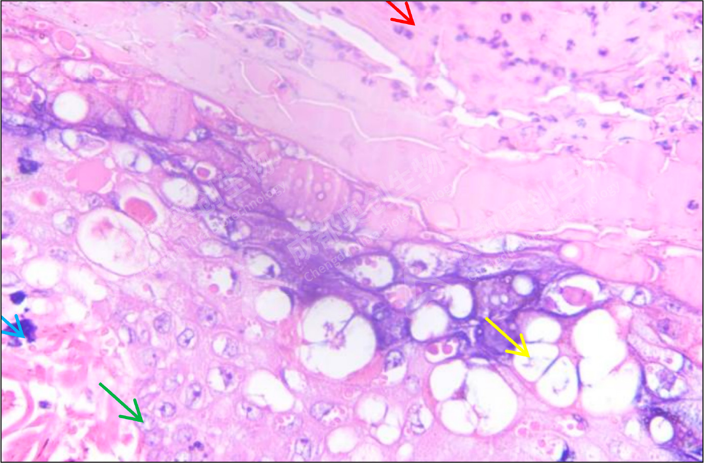 400x1 炎细胞浸润(红色箭头)、新生血管(蓝色箭头)上皮细胞增生(绿色箭头)脂肪细胞(黄色箭头)