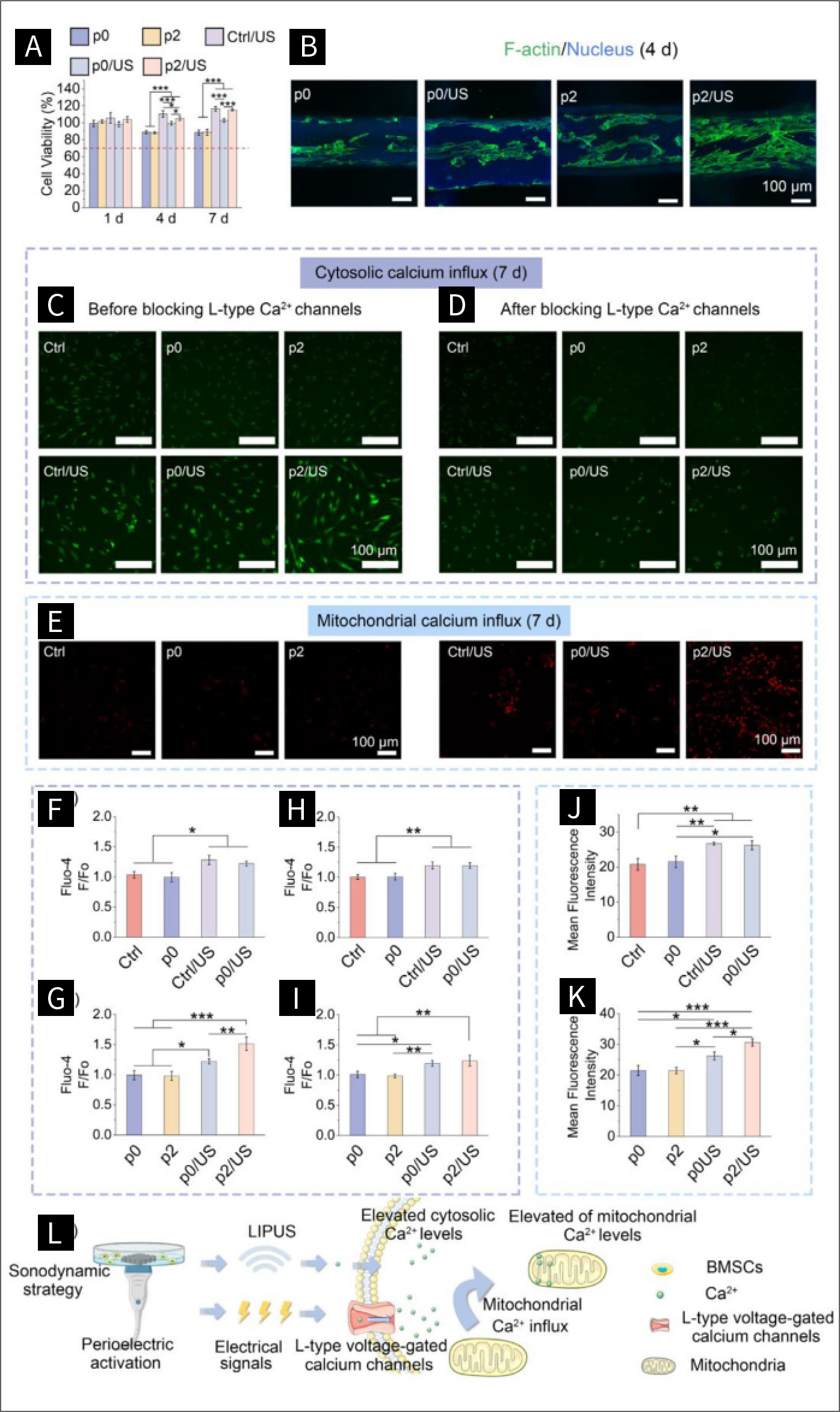图3展示了在不同支架上培养的BMSCs(骨髓间充质干细胞)的细胞行为,包括有无LIPUS(低强度脉冲超声)的情况。A)通过CCK-8测定法测量了BMSCs的增殖情况(n = 5)。红色虚线表示70%的细胞存活率。B)显示了培养4天的BMSCs的合并荧光图像。绿色代表F-肌动蛋白,蓝色代表细胞核。在使用维拉帕米抑制L型钙通道之前,培养7天的BMSCs的胞质Ca2+荧光图像(C)及其相对荧光强度(F/Fo)的定量分析(F&G)(n=3)。在抑制L型电压门控钙通道后,培养7天的BMSCs的胞质Ca2+荧光图像(D)及其相对荧光强度(F/Fo)的定量分析(H&I)(n=3)。培养7天的BMSCs的线粒体Ca2+荧光图像(E)及其线粒体Ca2+荧光强度的定量分析(J&K)(n=3)。L)描述了通过声动力策略激活细胞Ca2+流入和线粒体Ca2+流入的示意图。