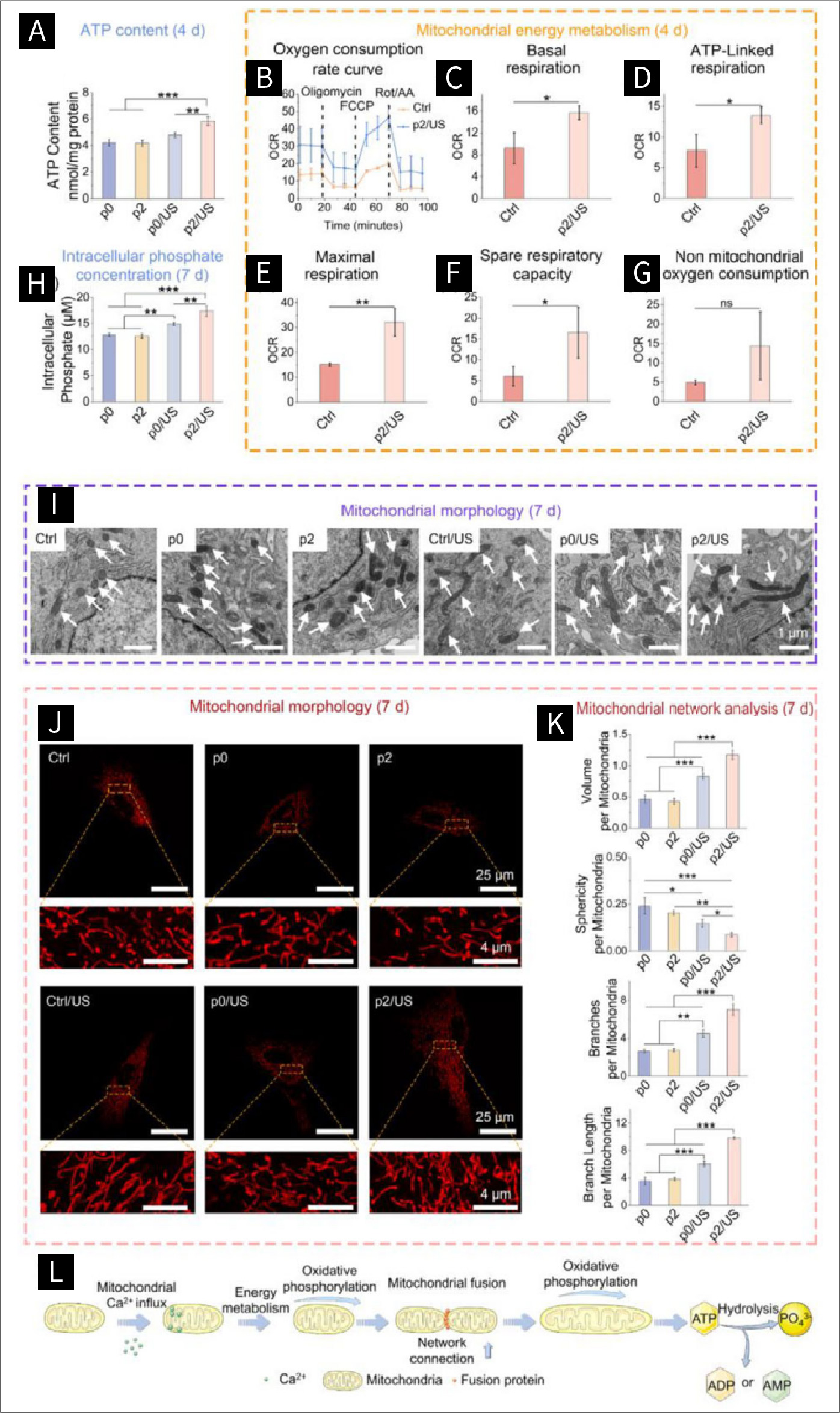 图4。通过声动力策略调节的骨髓间充质干细胞(BMSCs)的能量代谢和线粒体形态。A)第4天BMSCs的ATP含量(n = 3)。B)第4天BMSCs的OCR曲线(n = 3),OCR单位为pmol/min/10000细胞。根据OCR曲线对C)基础呼吸、D)ATP相关呼吸、E)最大呼吸、F)余量呼吸能力和G)非线粒体耗氧量进行量化分析(n = 3)。H)第7天BMSCs的细胞内磷酸盐浓度(n = 3)。I)第7天BMSCs的线粒体形态。白色箭头指示线粒体。J)第7天BMSCs的线粒体形态和K)线粒体网络分析(n = 3)。L)声动力疗法促进BMSCs能量代谢的示意图。