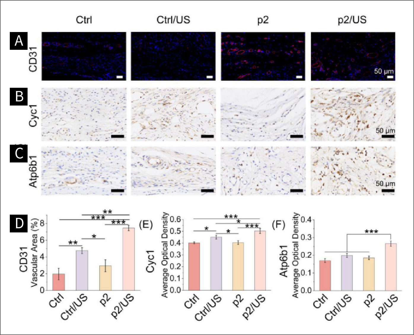 图7.大鼠术后第4周颅骨缺损区域的血管生成和线粒体能量代谢。A)通过免疫荧光染色检测血管生成标志物(CD 31,蓝色代表DAPI,红色代表 CD31);D)血管面积的半定量结果(n = 3)。B)通过免疫组化染色检测ATP生成的标志物Cyc1;E)Cyc1的半定量结果(n = 3)。C)通过免疫组化染色检测ATP水解的标志物Atp6b1;F)Atp6b1的半定量结果。