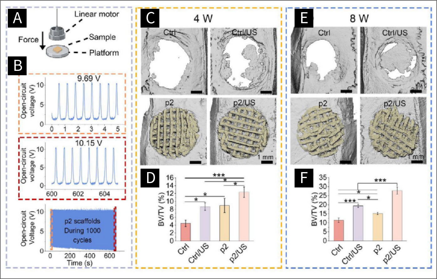 图8.A)压电测试装置在外部载荷(10 N,1.5 Hz)下的示意图。B)p2支架在1000个工作循环中的压电稳定性。缺陷区域(白色)和支架(黄色)的微CT重建图像分别在第4周(C)和第8周(E)。第4周(D)和第8周(F)的骨体积/总体积(BV/TV)定量统计分析(n = 3)。