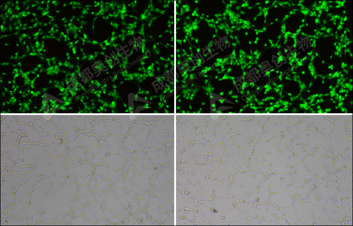 药物处理组:抗 VEGF 药物显著抑制管腔形成,表现为管状结构减少、分支点稀疏。