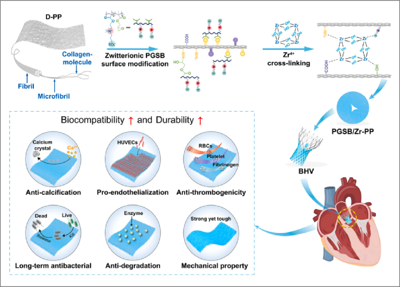 本研究提出两性离子表面修饰与锆离子(Zr4+)交联的协同策略,通过构建均质交联网络,同步提升 BHVs 的抗血栓、抗钙化、促内皮化及机械性能,为解决传统 BHVs 的临床局限性提供了新思路。
