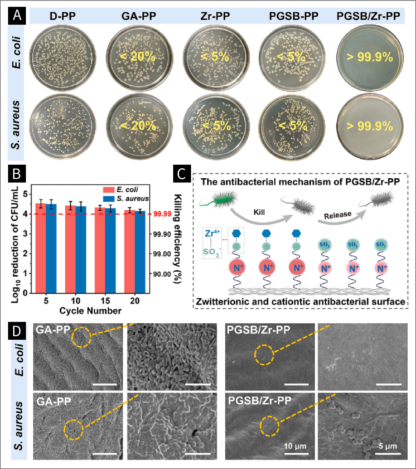 图四 (a)显示了大肠杆菌和金黄色葡萄球菌在D-PP、GA-PP、PGSB-PP、Zr-PP和PGSB/Zr-PP表面培养24小时后的菌落形成情况。黄色数字表示杀菌率,以D-PP为对照(n = 6)。(b)同一PGSB/Zr-PP样品对大肠杆菌和金黄色葡萄球菌的循环抗菌活性,通过20个循环(n = 6)。(c)PGSB/Zr-PP可能的抗菌机制示意图。(d)在高浓度金黄色葡萄球菌和大肠杆菌悬浮液中培养7天后,GA-PP和PGSB/ZrPP上生物膜形成的SEM图像。