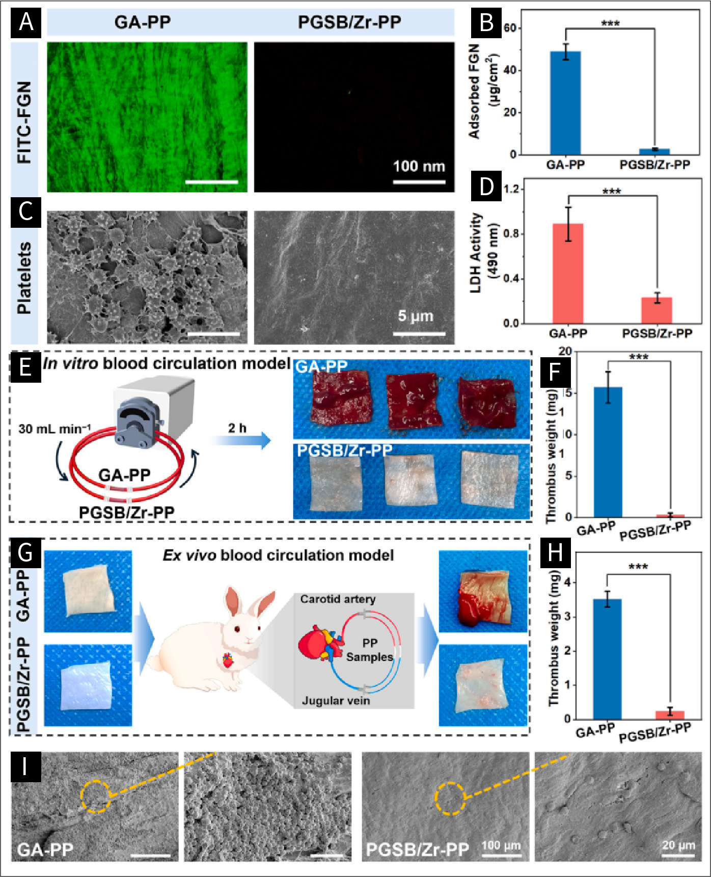 图五 (a)FITC-FGN吸附实验后,GA-PP和PGSB/Zr-PP的荧光图像。(b)使用微BCA蛋白测定法对吸附在GA-PP和PGSB/Zr-PP表面的FGN进行定量分析(n = 6)。(c)血小板粘附实验后,GA-PP和PGSB/Zr-PP的SEM图像。(d)使用LDH测定法对粘附在GA-PP和PGSB/Zr-PP上的血小板进行定量分析(n = 6)。(e)在体外动态人体血液循环模型中暴露后,GA-PP和PGSB/Zr-PP的代表性图像。(f)GA-PP和PGSB/Zr-PP上的血栓重量量化(n = 3)。(g)体外血液循环实验前后,GA-PP和PGSB/Zr-PP的代表性照片。(h)GA-PP和PGSB/Zr-PP上的血栓重量(n = 6)。(i)体外血液循环实验后,GA-PP和PGSB/Zr-PP的SEM图像。