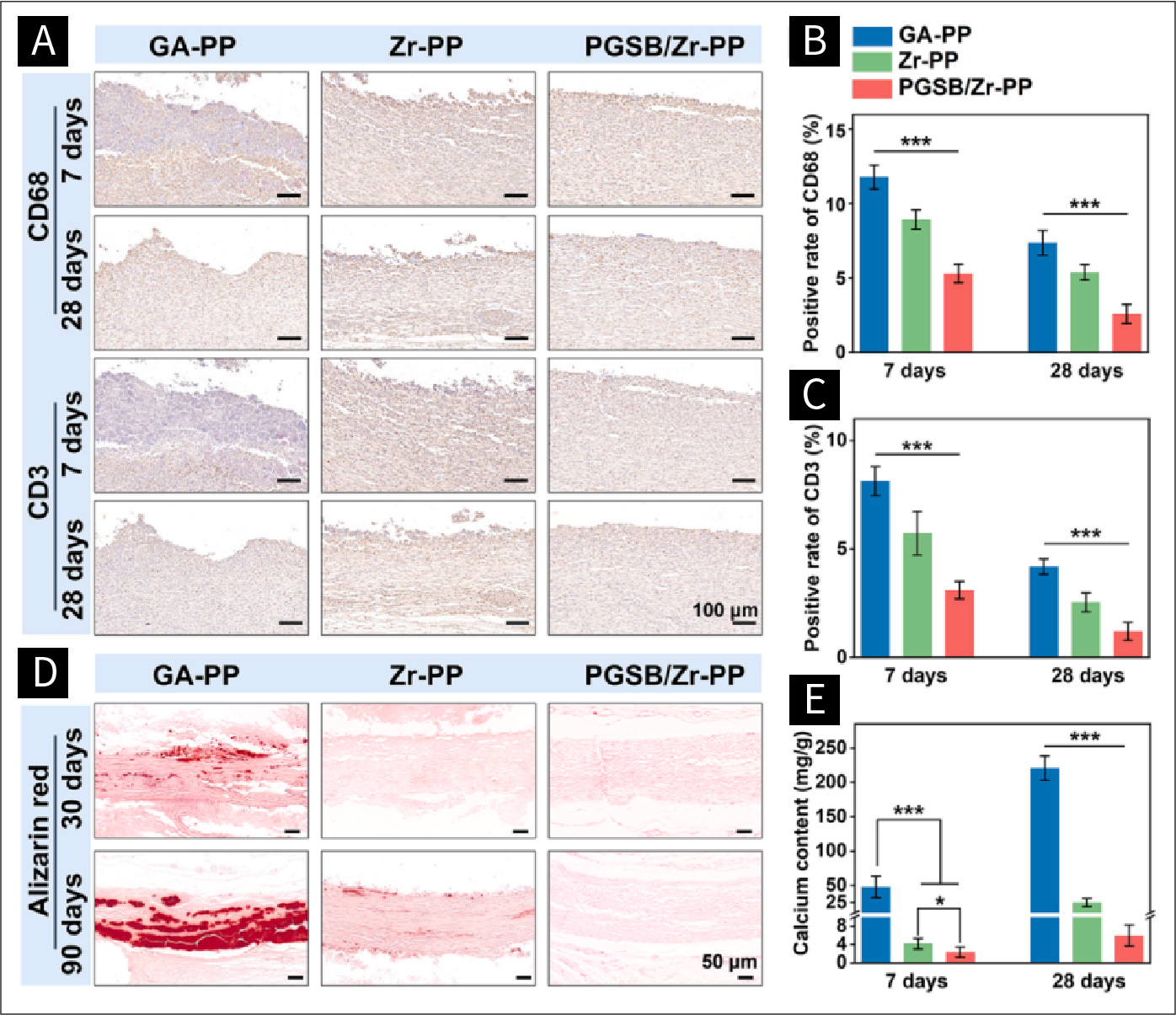 图七 (a)在SD大鼠皮下植入GA-PP、Zr-PP和PGSB/Zr-PP后7天和28天,周围组织的CD3和CD68免疫组化染色代表性图像。通过积分光密度法(n = 6)确定了(b) CD68和(c) CD3在相应组织中的阳性率。(d)在SD大鼠皮下植入GA-PP、Zr-PP和PGSB/Zr-PP后30天和90天的茜素红染色图像。深红色区域代表钙化沉积。(e)通过ICP−OES(n = 6)测定的GA-PP、Zr-PP和PGSB/Zr-PP在植入30天和90天后的钙含量。