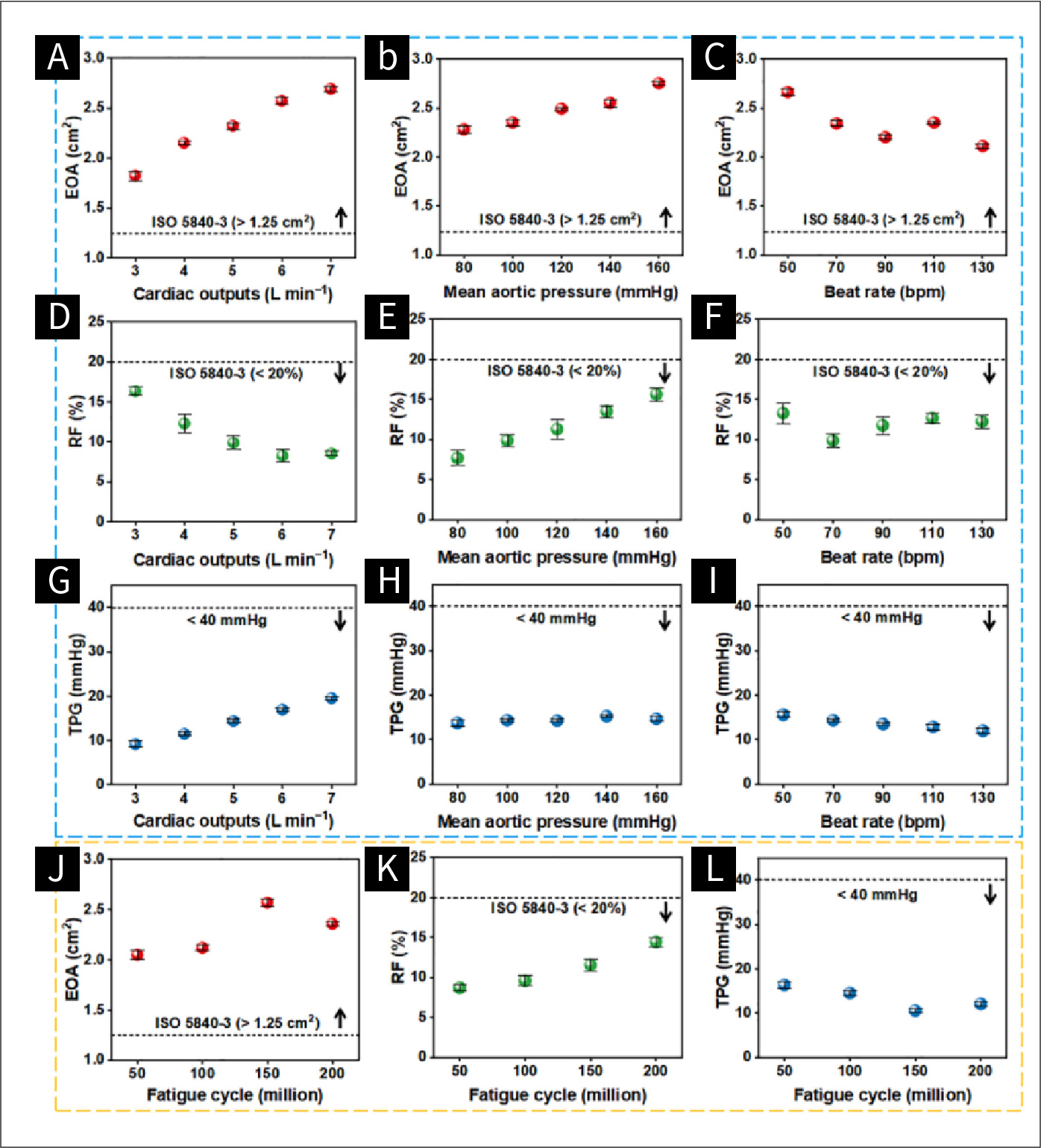 图八 在不同心脏输出量、平均主动脉压力和心率条件下,水动力性能如下:(a-c)有效孔口面积(EOA);(d-f)背漏分数(RF);(g-i)静脉瓣压力梯度(TPG)。在模拟生理条件下(心脏输出量:5 L/min;平均主动脉压力:100 mmHg;心率:70bpm)的水动力性能如下。不同的疲劳循环类型包括:(j) EOA;(k) RF;(l) TPG。