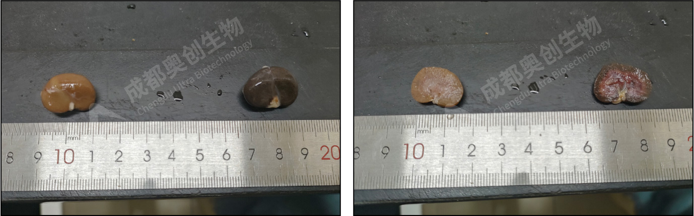 与对照组相比,固定后的实验组肾脏体积增大,颜色发黑,切面肾皮质增厚,肾髓质充血状,呈暗红色。详见图1。