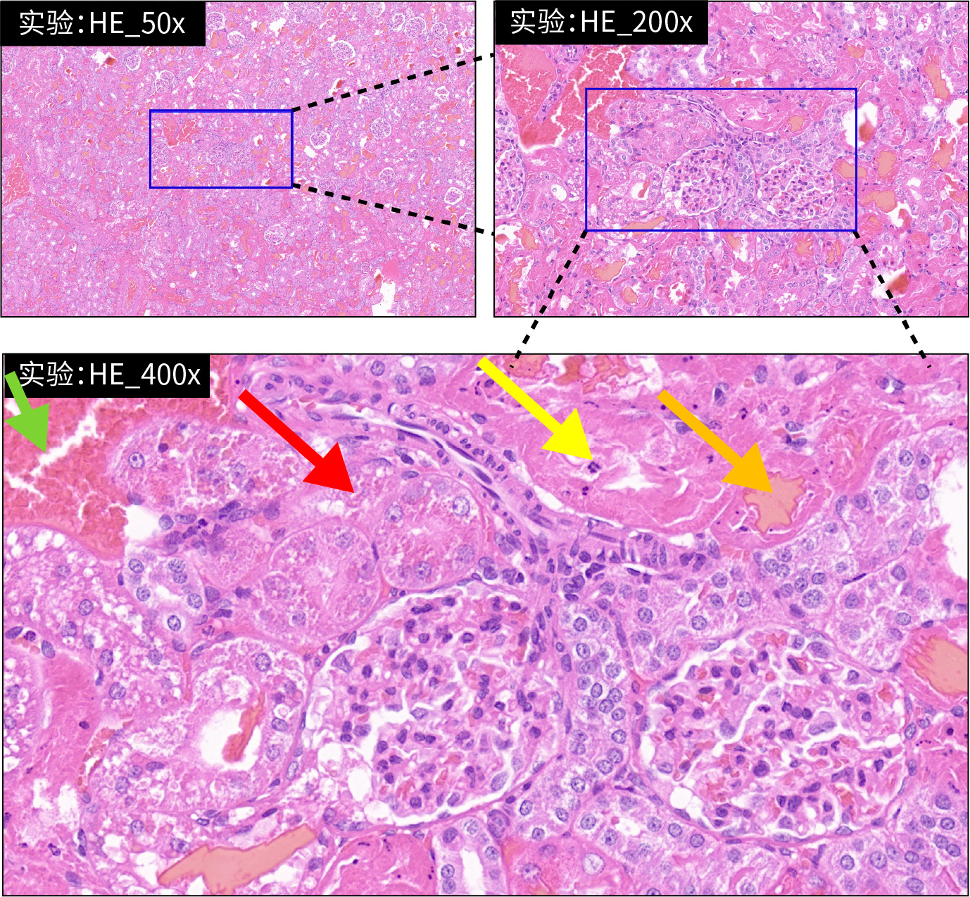 肾小管坏死(红色箭头)、透明管型(橙色箭头)、炎细胞浸润(黄色箭头)、充血(绿色箭头)