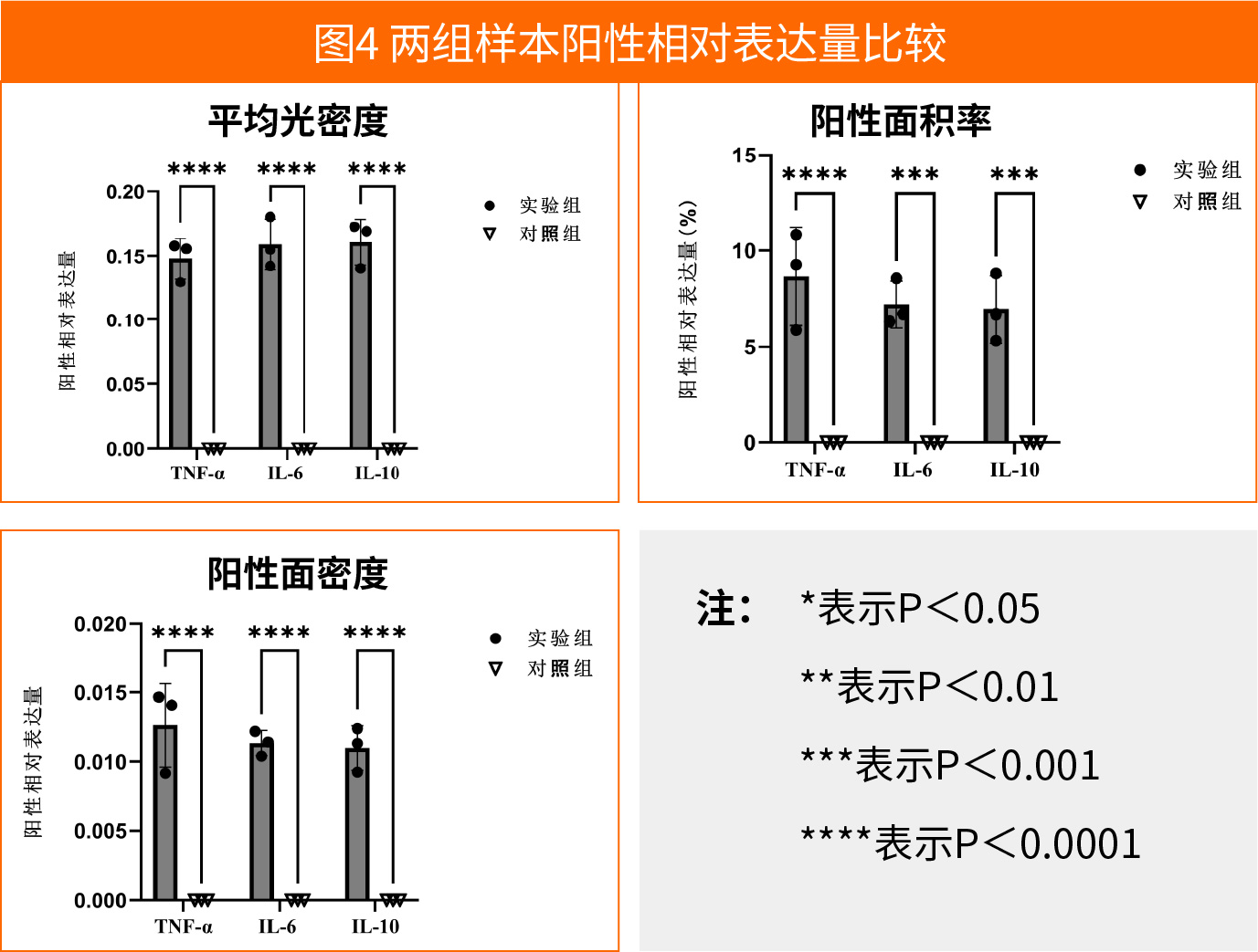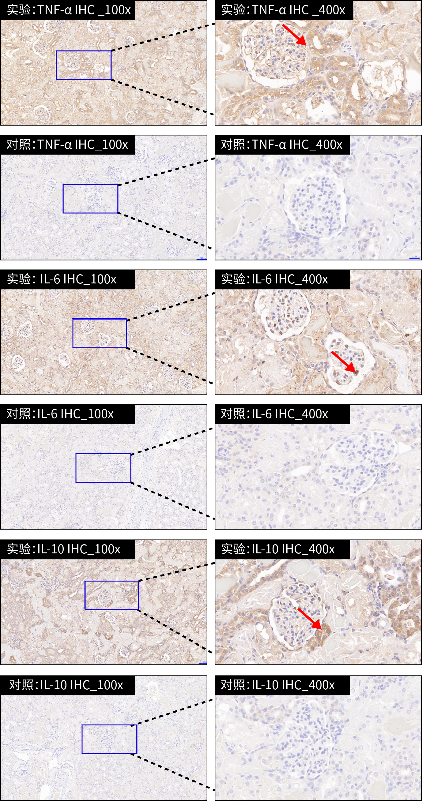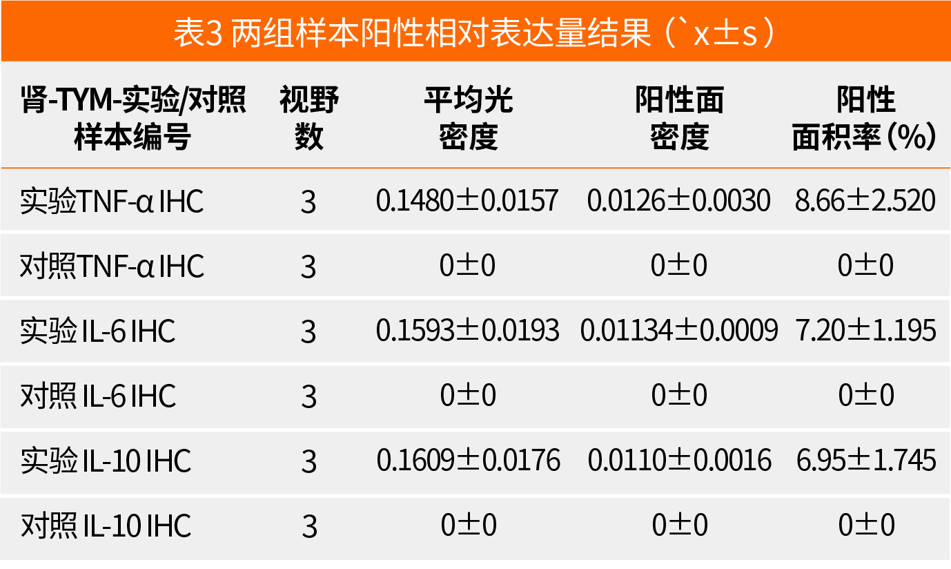 与对照组相比,实验组TNF-α、IL-6和IL-10蛋白的阳性相对表达量(平均光密度、阳性面密度、阳性面积率)显著升高(P<0.05),表明急性肾衰竭会继发急性炎症反应,使相关细胞处于高度激活状态并释放各种炎症(TNF-α、IL-6)、抗炎(IL-10)和免疫抑制细胞因子,而IL-6的持续高表达则意味着该疾病正在向慢性化、纤维化的不可逆阶段发展。详见图3、图4、表3、表4。