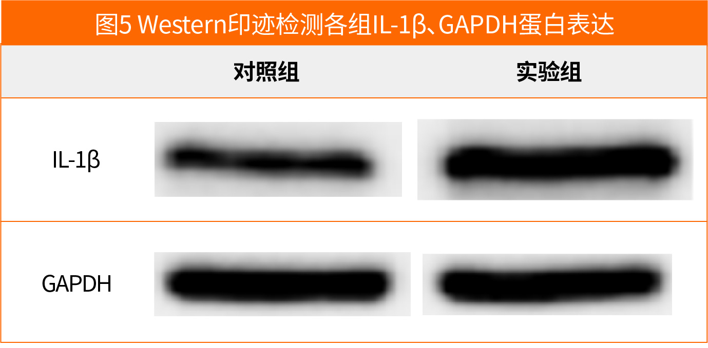 与对照组相比,实验组IL-1β蛋白表达量升高,作为内参的GAPDH蛋白表达量基本一致,表明肾脏内在的炎症反应被剧烈激活(IL-1β↑),并且这种炎症正在驱动和放大肾组织的损伤,这一结论真实可靠(GAPDH-)。详见图5。