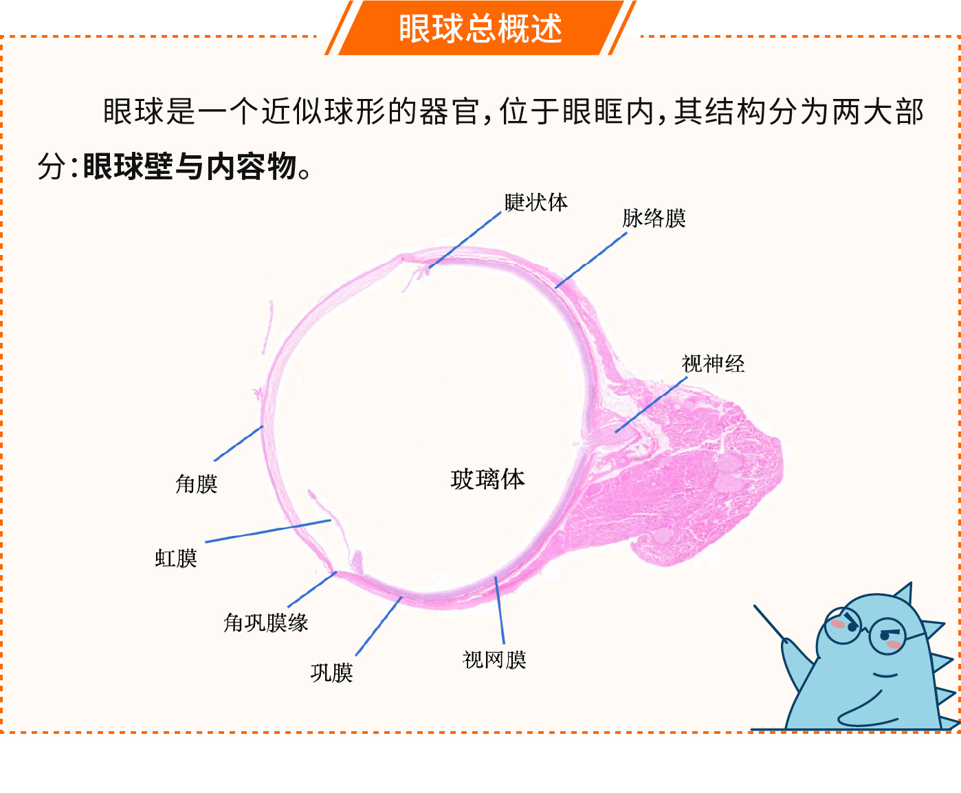 角膜(cornea):形似表玻璃,圆形,略向前方突出。角膜无色透明,是重要的屈光结构,由外向内分为角膜上皮、前界层、角膜基质、后界层和角膜内皮共五层。