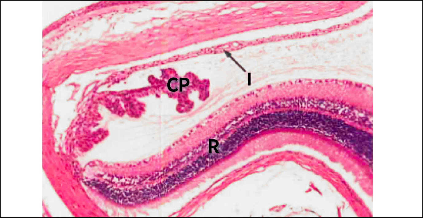 脉络膜(choroid):为血管膜后2/3部分,含大量血管和色素细胞。色素细胞多突状,密布于血管间的疏松结缔组织中。
