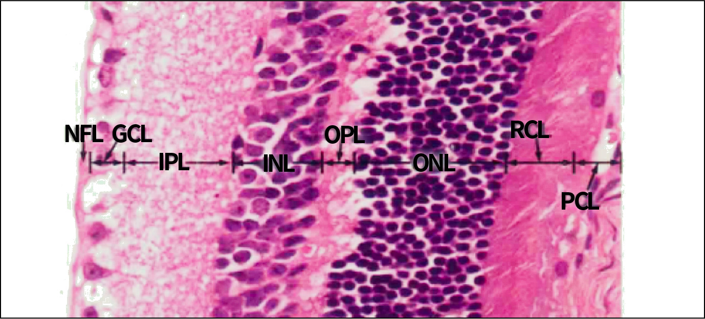 NFL/视神经纤维层、INL/内核层、RCL/视锥视杆层、GCL/节细胞层、OPL/外网层、PCL/色素上皮层、IPL/内网层、ONL/外核层