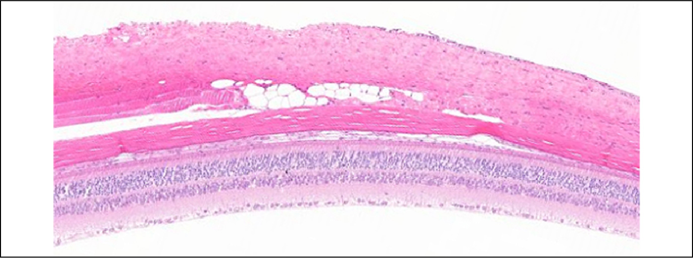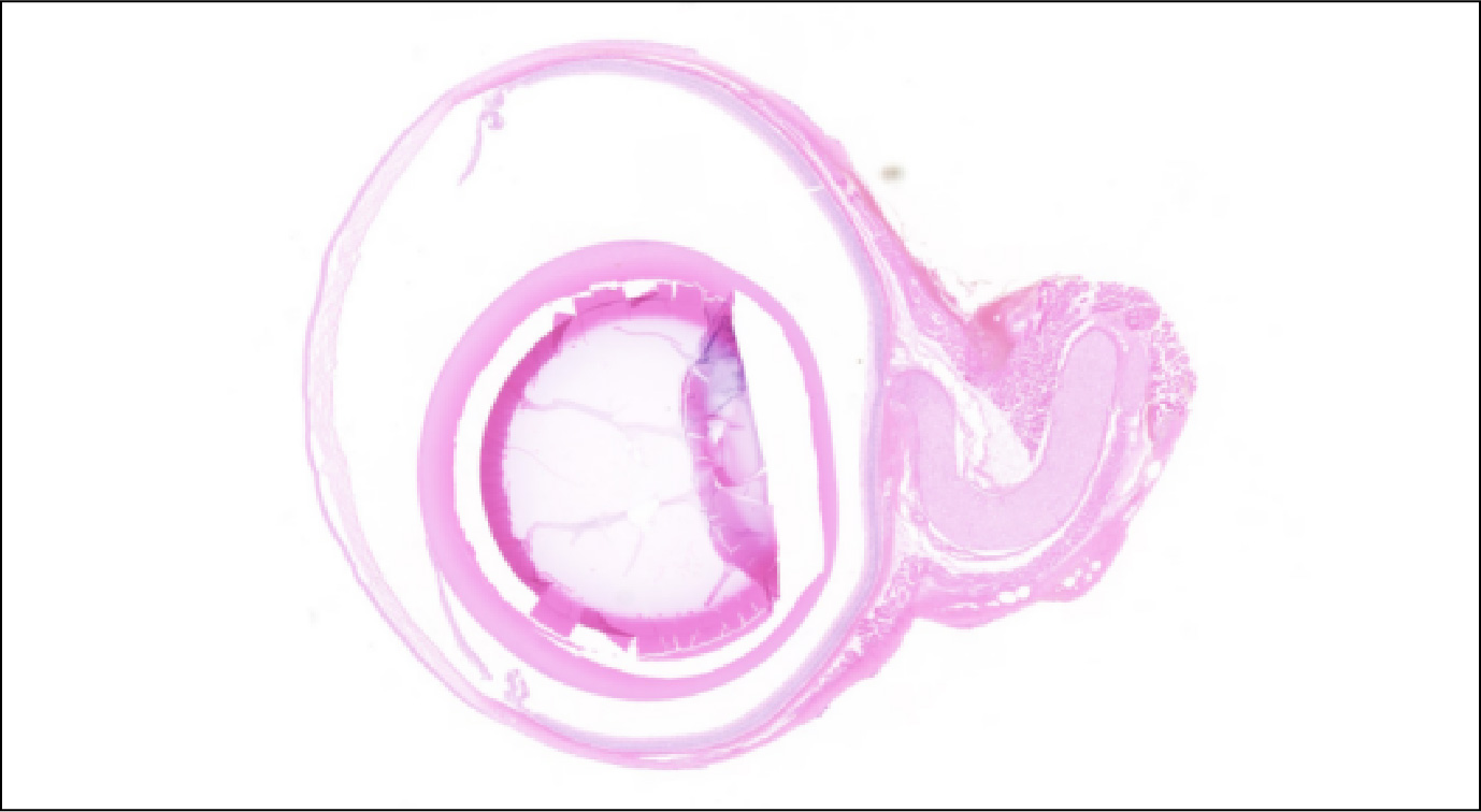 建议在取材时去除晶状体,晶状体成分较硬,染色后易叠片、掉落碎屑影响观察视野,如下图: