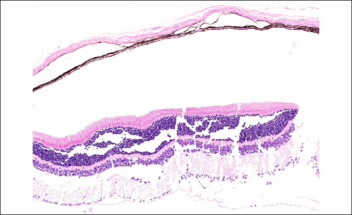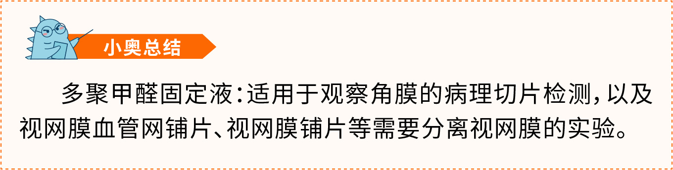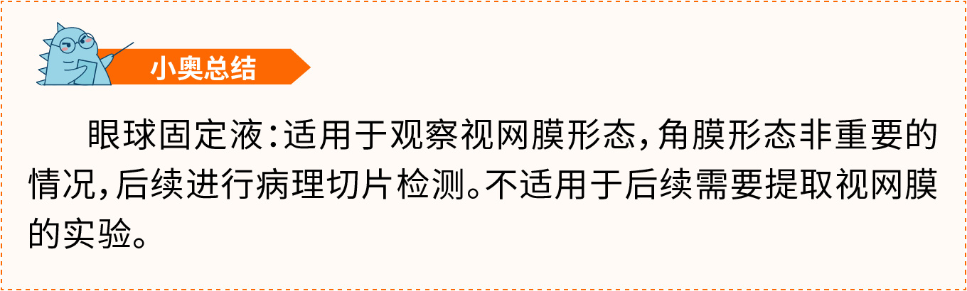 眼球固定液专门用于动物眼球后壁的固定,其渗透力强,与房水等渗,可快速渗透眼球后壁各层膜结构,将其及时充分固定,且不会因渗透压原因导致眼球变形分层,从而保证视网膜-脉络膜-巩膜连接紧密且分层清晰,不脱落,碎裂。同时也能较好保留抗原,不影响后续抗体标记及细胞核的染色。眼球固定液对角膜结构有一定的破坏作用,如需观察角膜结构,建议用多聚甲醛固定液。