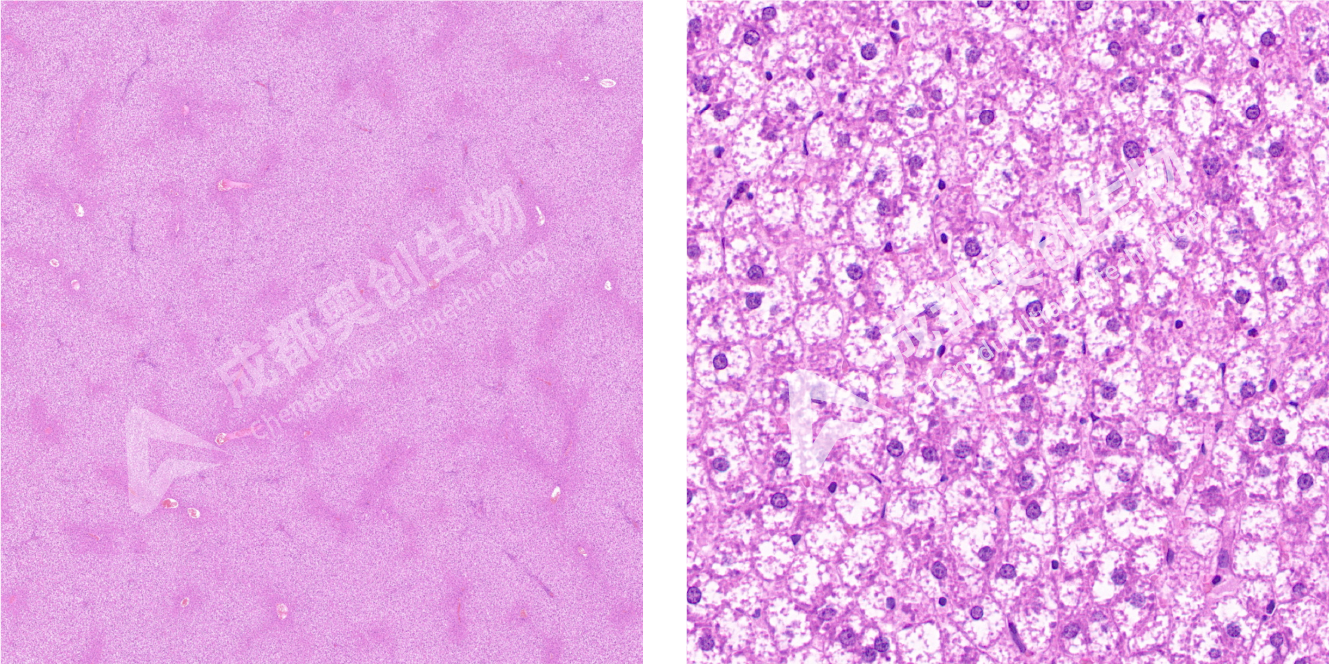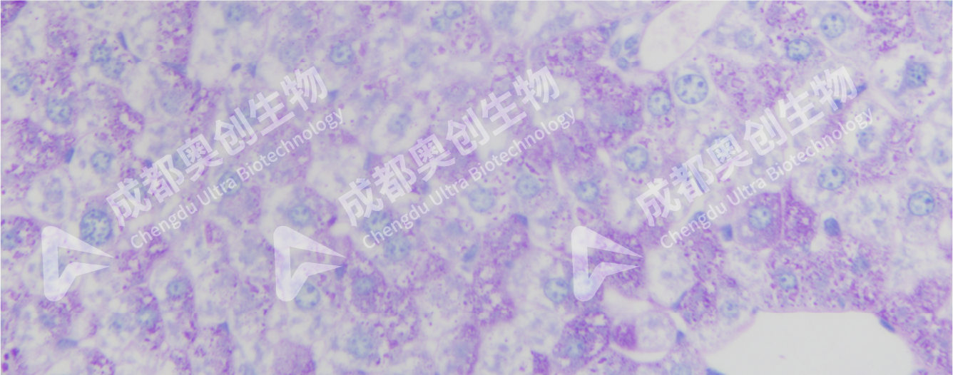 PAS染色:细胞核呈蓝色、糖原呈紫红色