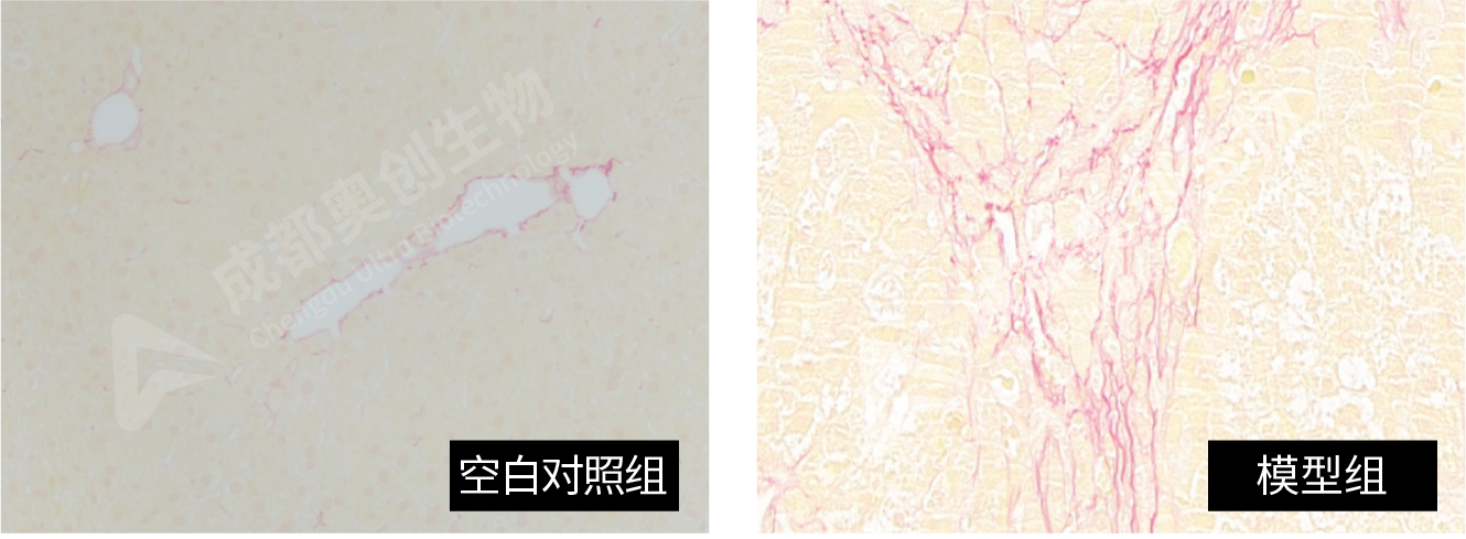 模型组腹腔注射20%CCL4,橄榄油溶液3mL/kg (CCL4:橄榄油=1:4),每周2次,间隔3天,连续8周,制备小鼠肝纤维化模型。空白对照组注射等体积的橄榄油,每周2次,间隔3天,连续8周。8周后进行样本采集与处理。