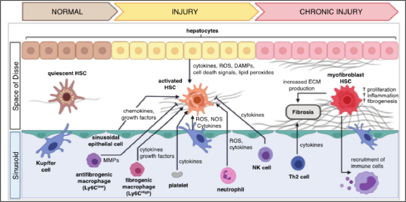 不同病因所致肝纤维化的组织学特征有所不同,肝纤维化的发生机制也较为复杂,其中涉及到肝星状细胞激活、巨噬细胞的作用、肝窦内皮细胞的作用、炎性小体与焦亡以及间充质干细胞的作用等。